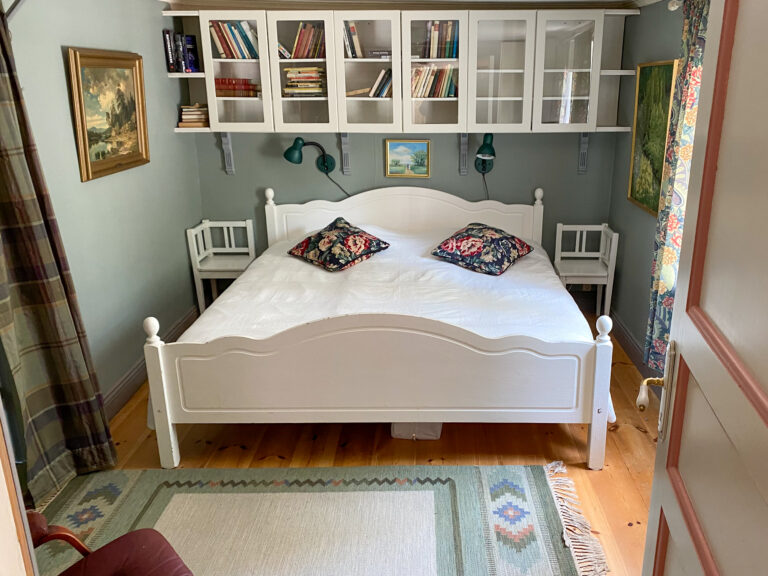 Ett sovrum och ett bibliotek med bäddsoffa. Egen toalett med dusch. Tillgång till kök och altan.